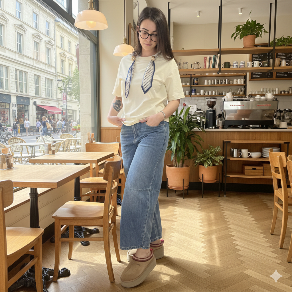 Sfat UrbanChic: Adaugă un tricou simplu și o jachetă elegantă - lasă croiala blugilor să facă restul.